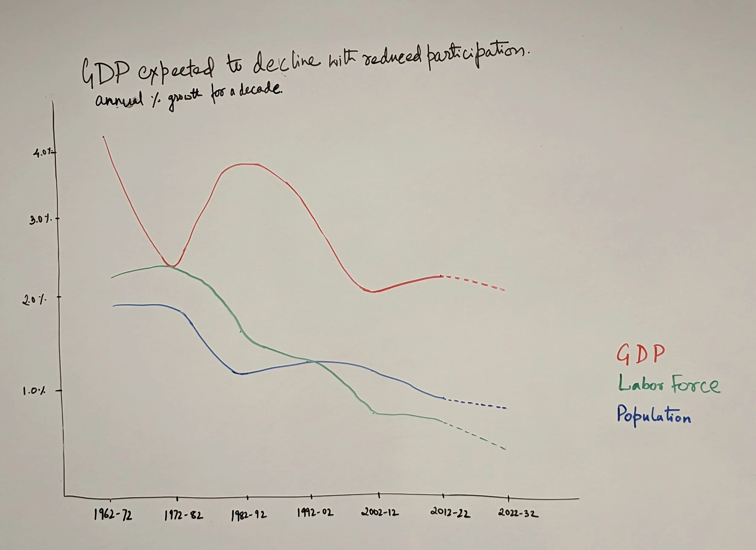 With this new insight, my prototype visualization was telling me much more that what I had initially gained from it. Not only is the growth in Population and Labor force decreasing, their relative trend has reversed after the 1902-2002 time period. What I mean here is that the growth in labor force was higher than the growth in population before 1902, which would mean that growth in GDP would not be affected drastically even if the population growth slows. However, after 2002, the growth in labor force has slowed down when compared to population. This signifies that people are increasingly opting to not contribute towards the work force as they used before. Which would mean an exacerbated decline in GDP is imminent. Hoping to convey these ideas, I made an attempt to re-do my prototype.